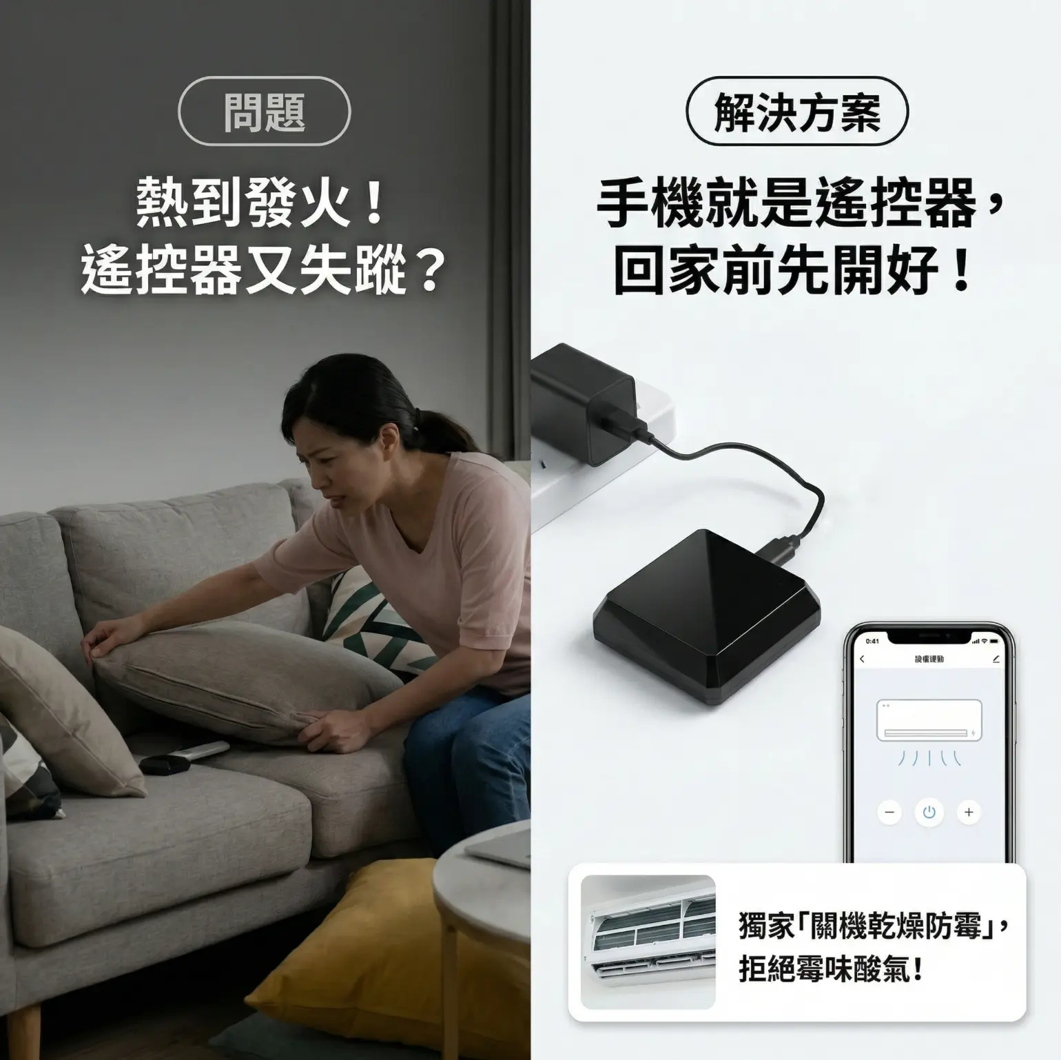 遙控器總是愛玩捉迷藏: 天氣悶熱想開冷氣,遙控器卻總是不在身邊,翻遍沙發縫隙滿頭大汗。